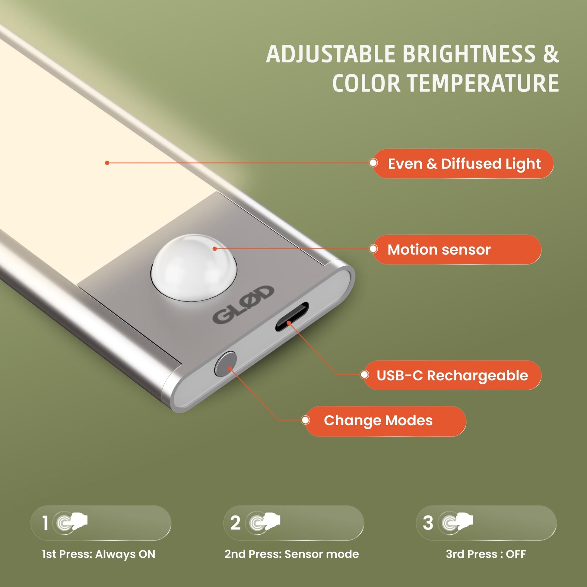 Our light lets you adjust both brightness and color temperature. Hold the button to switch from bright task lighting to a soft, cozy glow.